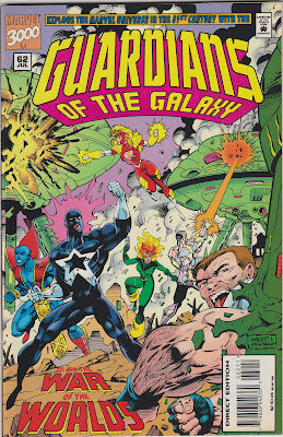 Vance's suit had been augmented by a transfusion he had received from Simon "Hollywood" Williams: it had been acting maybe like a symbiote, but was maybe just Vance's hormones acting up. Reunited, the Guardians listen to Mainframe (formerly the Vision) and his plan to travel back in time, and stop "the War of the Worlds," the Martian attack of earth. The Martians had received aid from a force from outside the galaxy, but the Guardians travel back to June 29, 2001 and interrupt it. With a thousand years of technology on them and a furious Simon, the Guardians destroy about two-thirds of the Martian force. But, as the Guardians return to their own time, they are sabotaged by a stowaway: their old foe, Wormhole!...yeah, nobody remembers him. He was an Inhuman, and had been working under Loki around GOTG #40. The Guardians survive a flaming crash, but where they landed...no one can say. (Mildly curious that the whole team wasn't lost together, but Starhawk was the one to go off himself the most.)