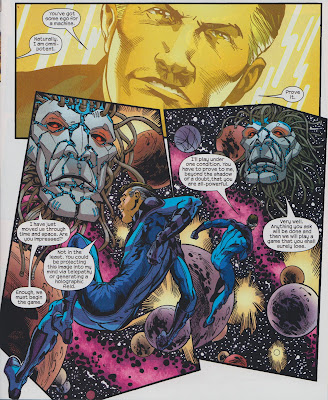 Reed's search for intelligent life in space brings the Grandmaster to the Baxter Building, where he immediately slaps the Four into some games: the Torch in a flammable nebula filled with planets, the Invisible Woman in an invisible monster-filled maze, the Thing in a shrinking force-field, and Reed versus super-computer Intellitek. Most of the team has to work out the counter-intuitive solutions, or work their powers differently; while Reed just asks the computer if it was omnipotent, to prove it. He uses a fairly well known paradox that for some reason I swore was from Monty Python.