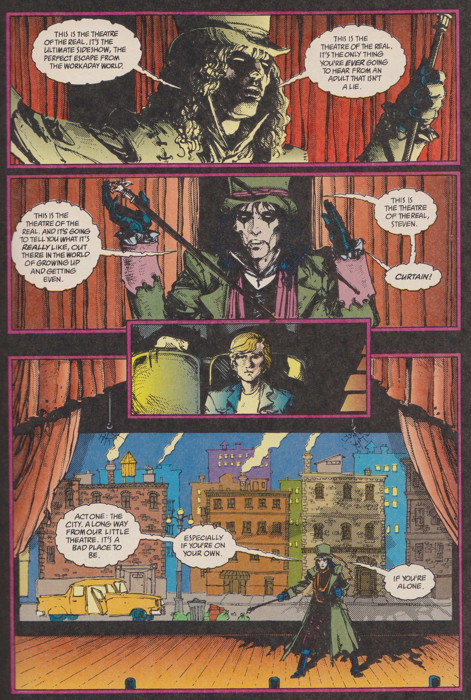 Alice Cooper has his name above the title, but apparently not in the indica? This was a tie-in to his thirteenth album, and it and the comic shared a plotline: Cooper, in the role of a mysterious showman, entices young Steven to his show, "the theatre of the real." While the title indicates he wants to tempt Steven to something, act one doesn't seem like a great start: a nightmare of life of the street, with corpse-like junkies cold and alone. Cooper suggests he could either risk that, or stay in the theatre, it's fun! Also you never grow old, or leave...