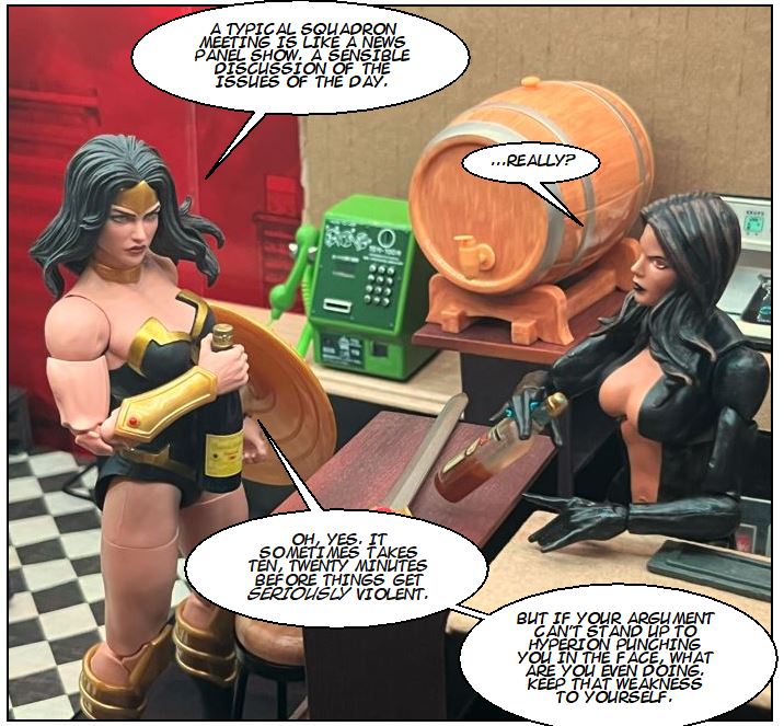 Power Princess rattles off the "utility positions" they were looking to fill for the Squadron: usually, their "magic chick" was Arcanna, who of course is based on Zatanna. Satana isn't based on her, and aside from the similarity of their names, is she a good fit? The Princess thinks so, possibly because she wants a drinking buddy. Poor Machine Man has been conscripted for the Red Tornado slot: I don't recollect the Squadron usually having a robot member, except maybe Tom Thumb's helpers. Also, MM's purple finish still looks sharp, but I almost wish Hasbro would knock out a red-finish version, like in his limited series, set in the far-off future of...um, four years ago?